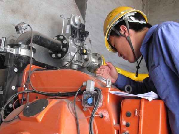 8月5日,yl23455永利集团公司复合肥车间装置检修重点技改项目——干燥窑热风炉“燃煤改燃气”技改试点火一次性成功。改造后的燃气热风炉采用智能控制,操作安全稳定,热效率高,经济环保。图为该车间技术人员正在观察热风炉内燃烧情况。