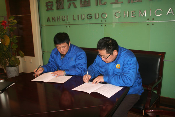 图为该公司副总经理张斌与磷酸车间负责人许进冲签订《安全生产目标管理责任书》。