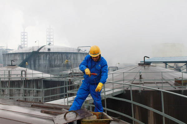 图二:当天,王明海在罐区车间1号酸罐顶部取华兴公司硫酸样。