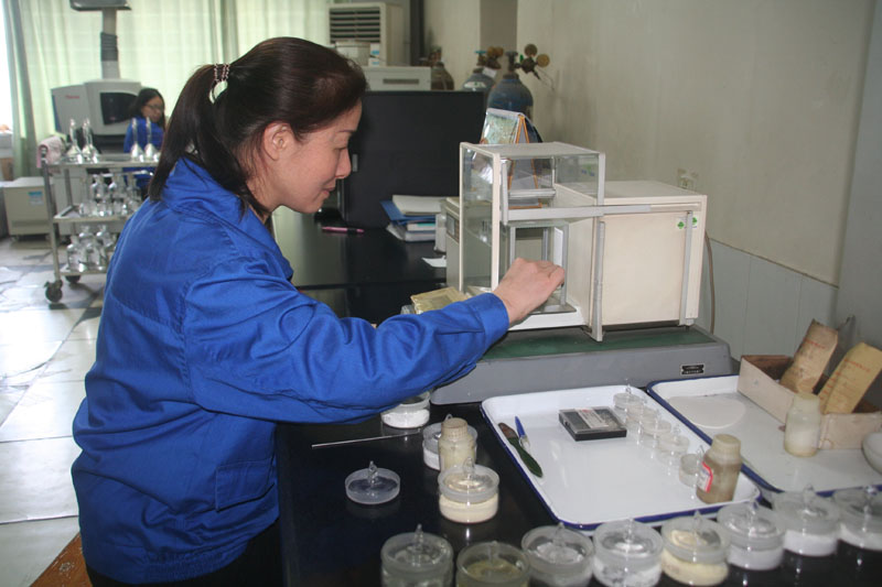 1月份以来, yl23455永利集团公司也先后签订了出口南美的55%粒状磷酸一铵合同和出口韩国的61%磷酸二铵合同,两项产品均为散装出口,其中55%粒状磷酸一铵6000±10%吨,61%磷酸二铵3500 ±10%吨。自3月4日起,该公司组织好产品的连续生产、质量检验和按时装运外发工作。图为3月10日上午,该公司检验中心员工正在检测55%磷酸一铵出口产品的质量指标。 ( 陈 沐)