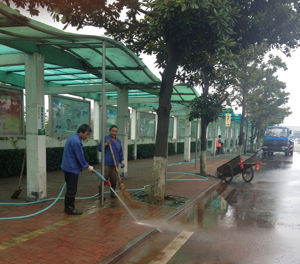 图二:梅雨季节,该公司员工上下班车候车亭地砖滋生青苔。为防止人员行走时滑跌,该公司政工部文明综治委组织人员清除地砖青苔,并计划于近期对地砖进行改造,以彻底消除这一安全隐患。