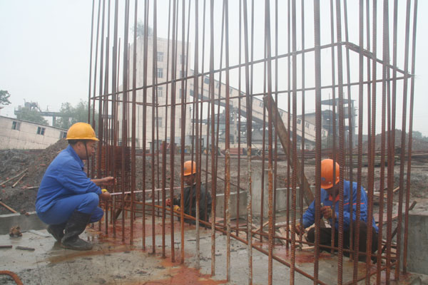 图一:7月9日上午,天空下着淅沥小雨。施工人员在5#码头细碎厂房设备基础施工现场绑扎钢筋。