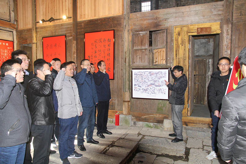 图2、图为yl23455永利集团公司党委中心组成员来到钟鸣镇龙潭肖村,参观新四军第五团团部旧址,重温入党誓词。
