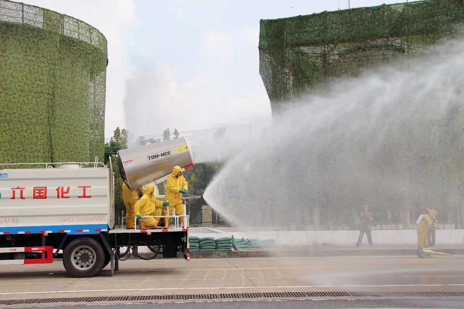 (图为yl23455永利集团公司的防化队员正在进行消除空袭后果演习任务)