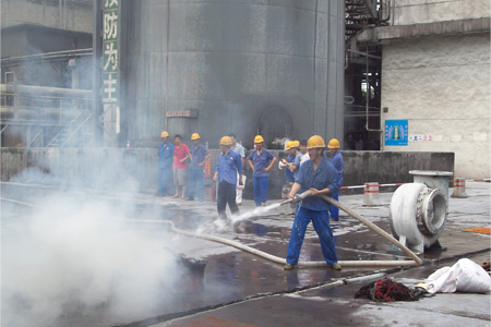 在该公司磷酸车间消防演习活动中,演习人员在两只油桶内点燃线头模拟“火情”,车间技术员和班长组成的救火队整装待发。随着车间安全员沙玉海的一声令下,救火队员迅速冲向着火点,熟练地打开灭火器灭火。演习虽然只有短短几分钟,却给大家留下了深刻的印象。通过此次演习,车间大部分员工掌握了灭火器的正确使用方法。