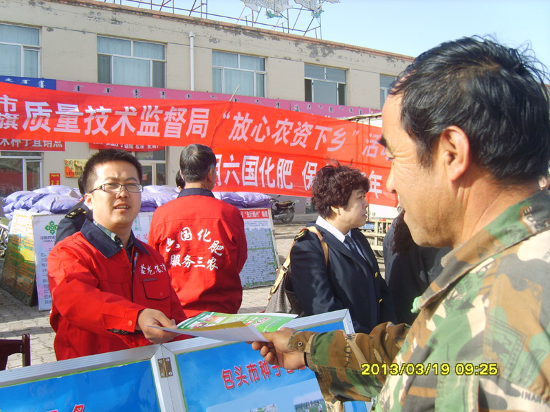 近日,内蒙土右旗工商局2013年服务“三农”红盾护农宣传维权暨放心农资下乡现场会在土右旗双龙镇召开,内蒙古电台经济生活广播《天天3·15》进行了现场直播。yl23455永利集团农化服务人员在活动现场向前来参会的农牧民发放了上千份的农化服务手册和辨别真假肥料“明白纸”。yl23455永利集团土右旗直销点联销商、土右旗农资协会会长倪志亮现场带头交纳了5万元的“农资先行赔付抵押金”,并就“农资先行赔付制度”从制度上杜绝经营户经销假冒伪劣农资的做法接受了《天天3·15》栏目的现场专访。